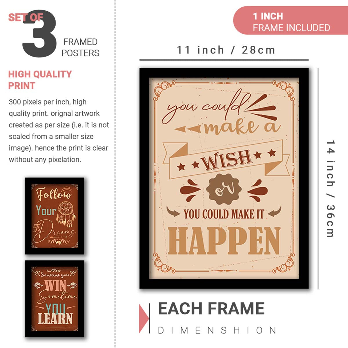 - SIZE AND QUALITY Dimension:- 11 inch x 14 inch Print Quality: The artwork is printed on 300 GSM thick paper with high quality printer and vibrant colors, to give it rich look.; PREMIUM QUALITY MATERIAL - This product come with high-quality non-breakable polycarbonate glass (plexi glass), and frame is made of synthetic wood which makes it long lasting yet modern and attractive.